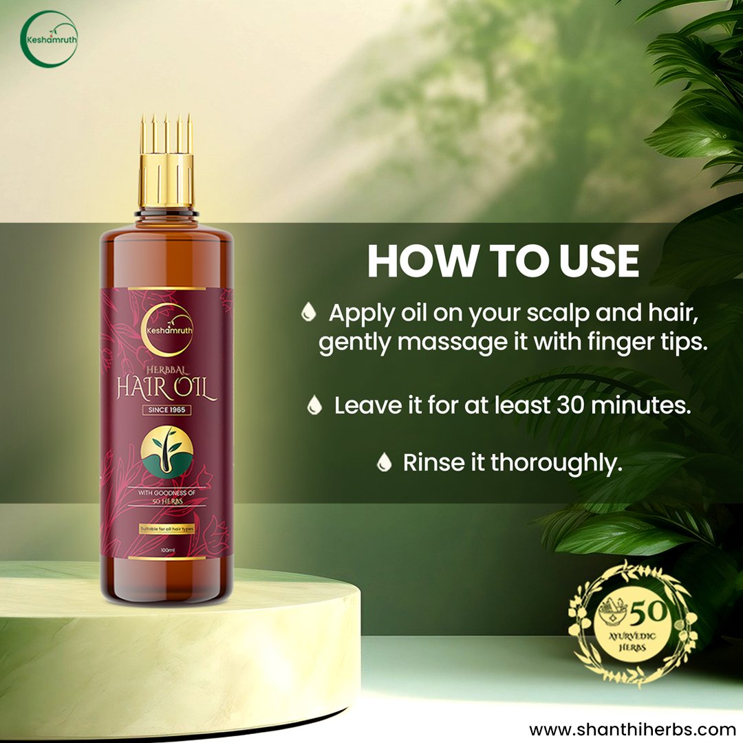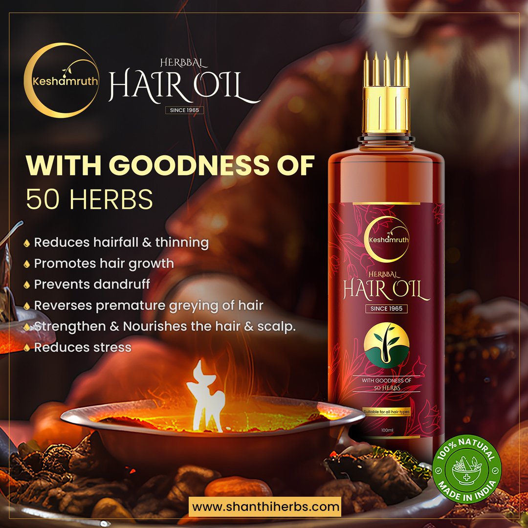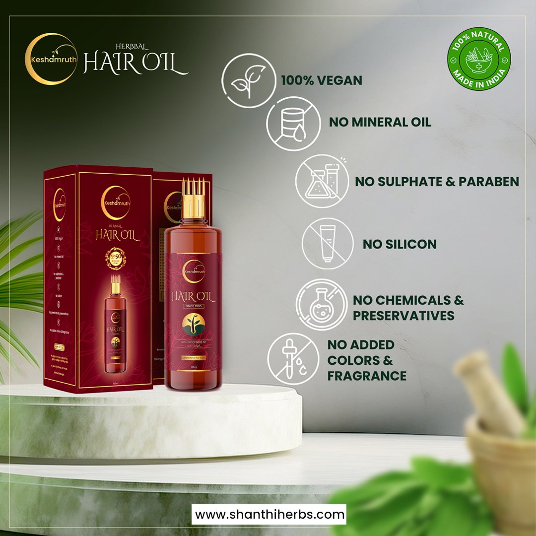 Keshamruth Herbbal Hair Oil is a luxurious blend crafted from centuries-old Ayurvedic wisdom, using around 50 meticulously selected herbs. Cultivated in the lush landscapes of Kerala, each ingredient undergoes a precise 14-day preparation process to ensure maximum efficacy. This potent formula not only prevents hair loss but also promotes hair regrowth, addressing all hair concerns from dandruff and hair damage to breakage. Rich in natural nourishment, Keshamruth Herbbal Hair Oil revitalizes the scalp, restores hair health, and enhances texture, leaving your hair strong, shiny, and resilient. Experience the transformative power of nature with Keshamruth, your ultimate solution for complete hair care.